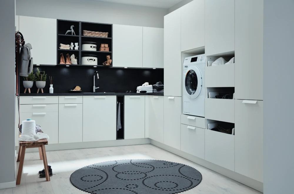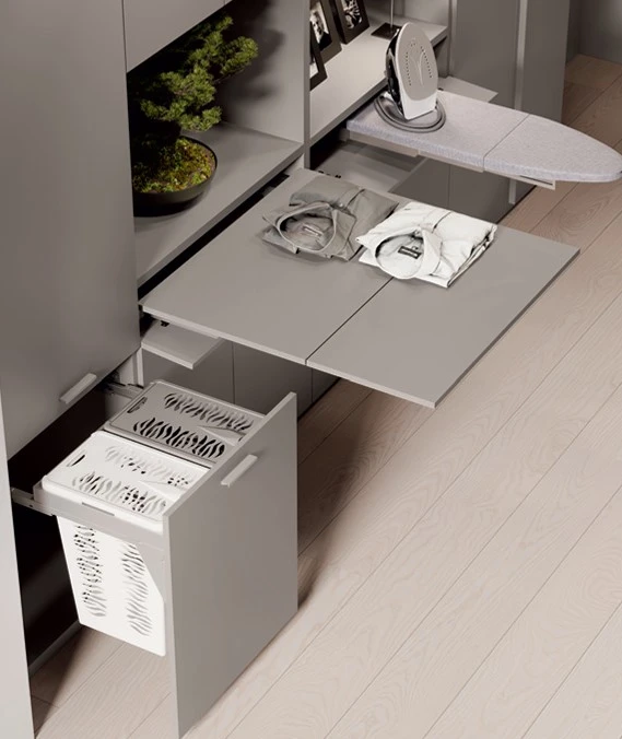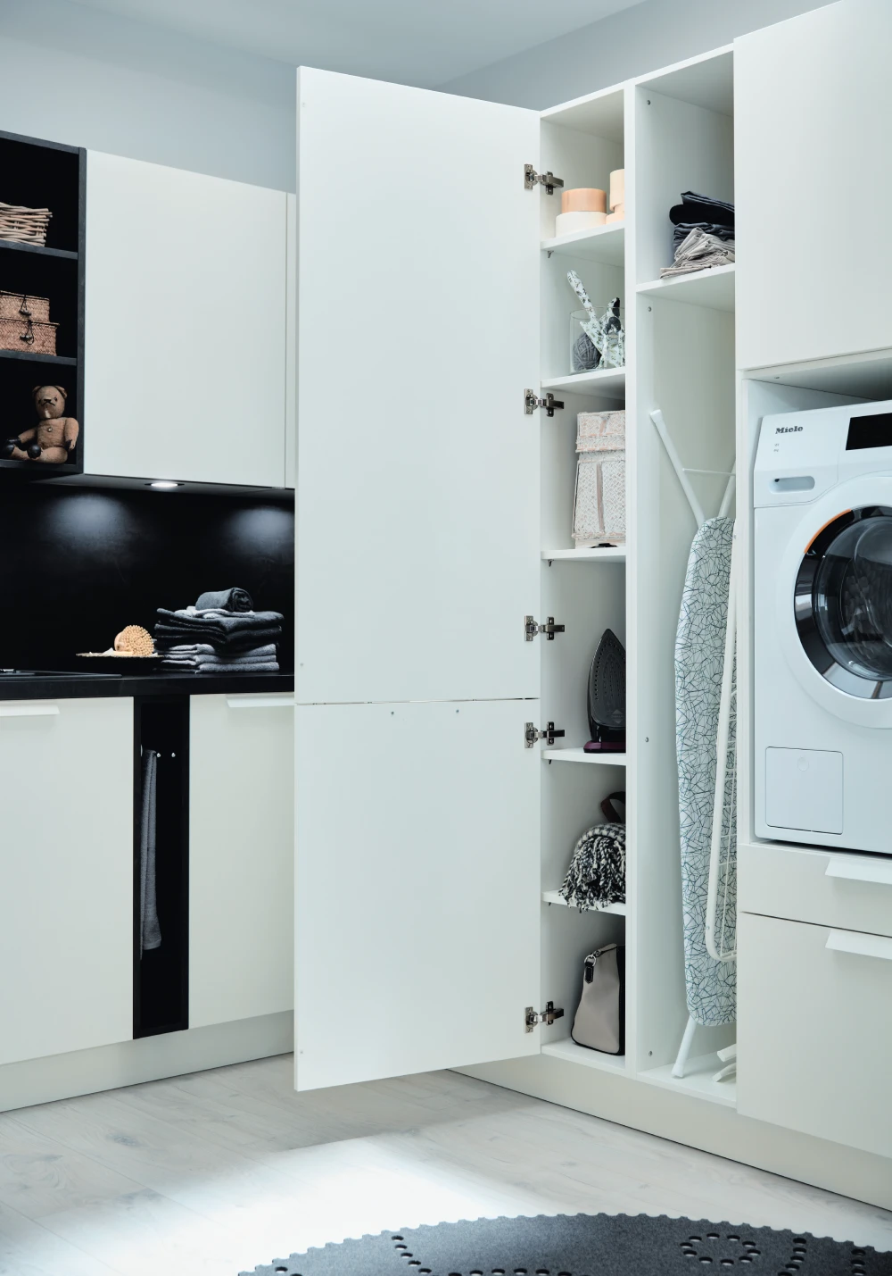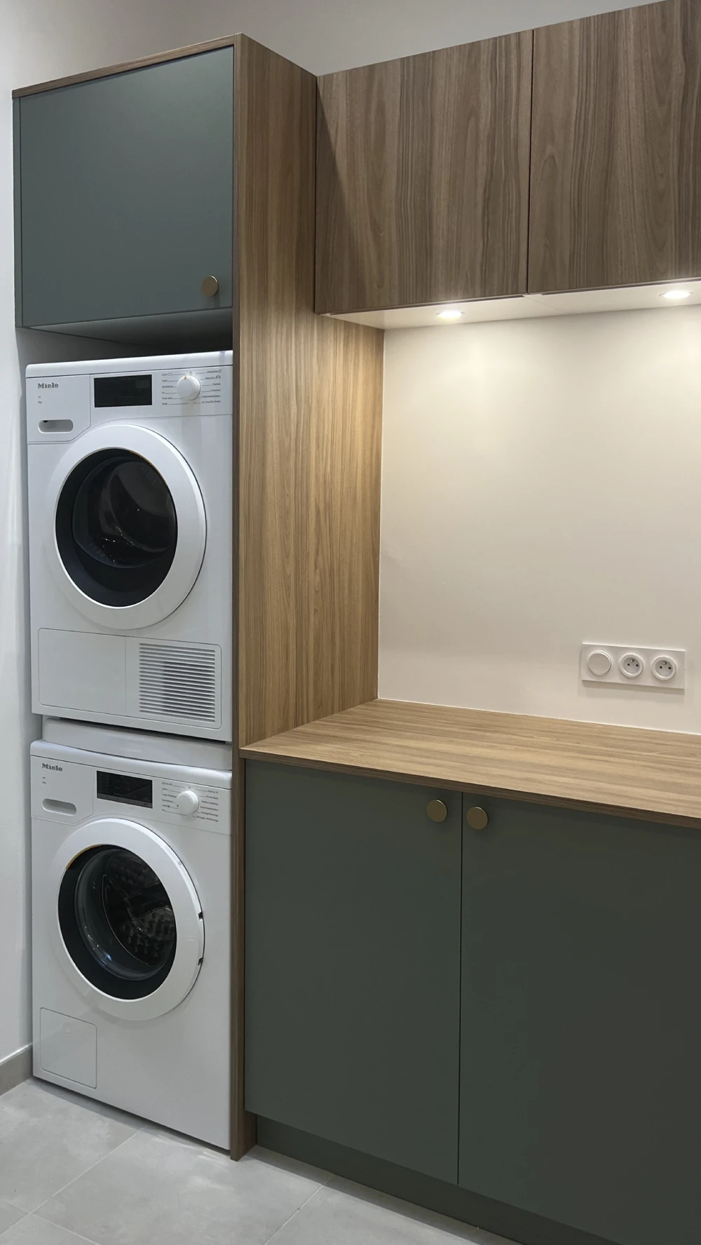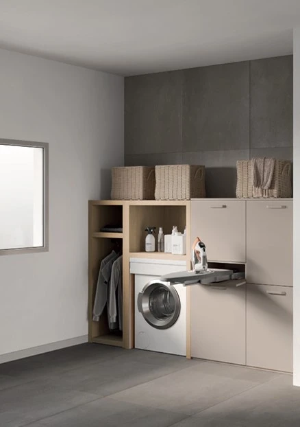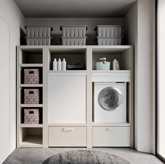 La buanderie ne doit pas être un espace négligé. Nous créons des aménagements fonctionnels, avec des rangements intelligents et des plans de travail pratiques, pour faciliter les tâches ménagères tout en conservant une esthétique soignée. Fournisseur NARDIINTERNI©