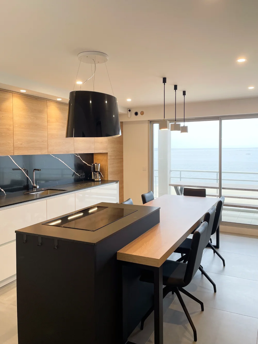 Plan de travail granit noir Zimbabwe et table en Silestone© Blanco Zeus. Pose : Granico 33