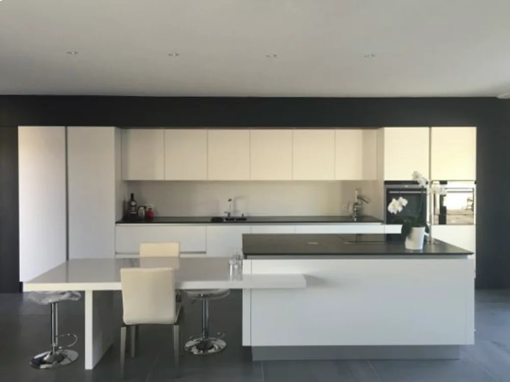 Meuble Armony© modèle Kappa, poignées bois, coloris laque UV X-White mat, plan de travail et crédence Creta.