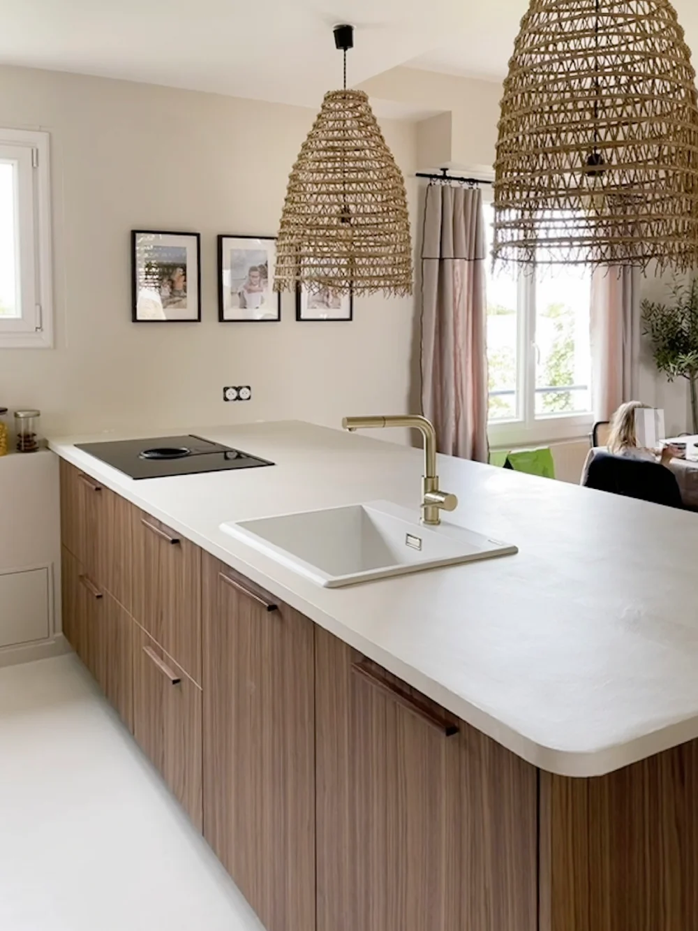 Meuble Armony© modèle Rho, gorge creuse, coloris mélaminé Skin Cachemire, plan de travail et crédence stratifié Bianco Ghiaccio.