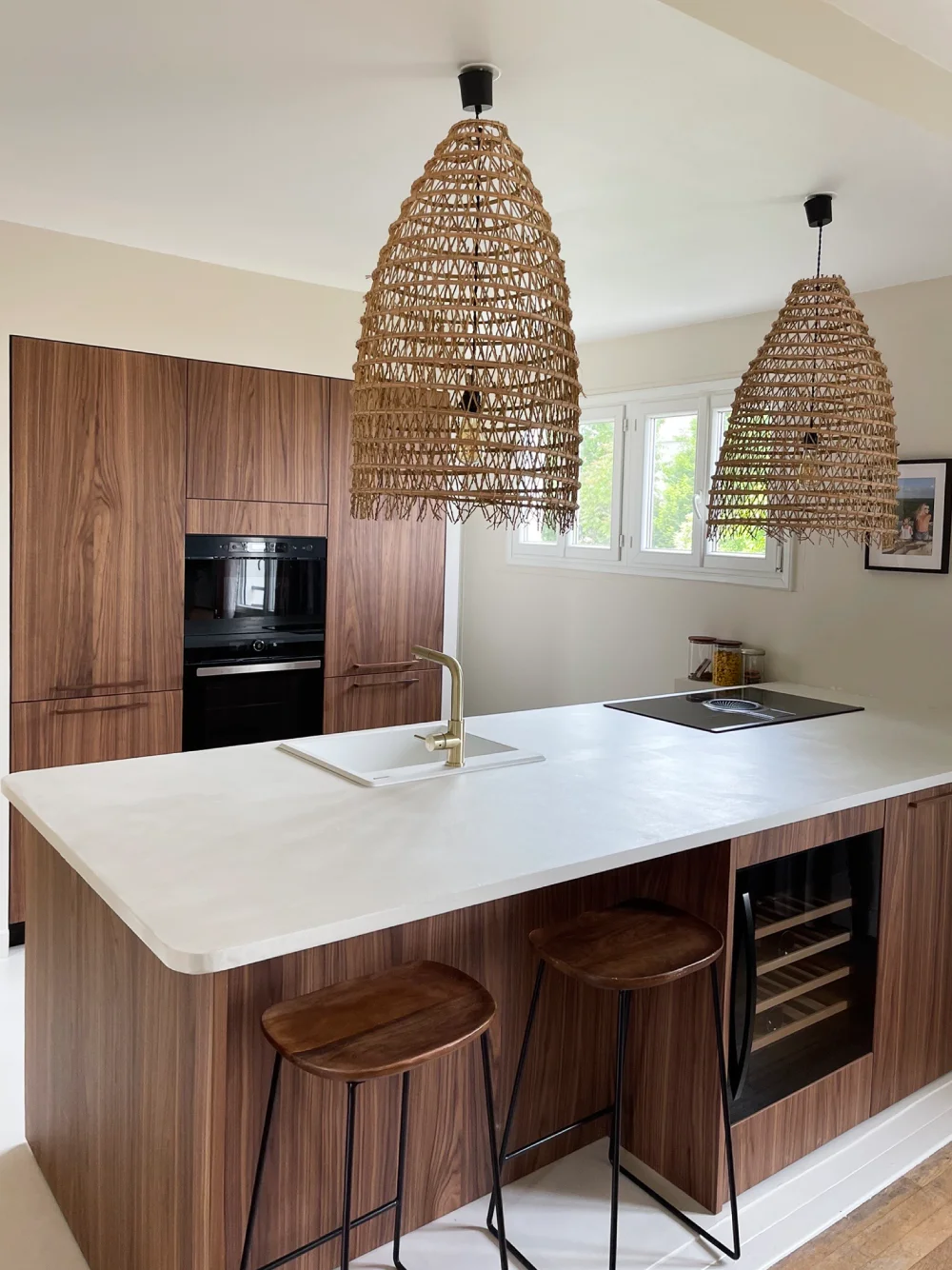 Meuble Armony© modèle Yota, poignées bois, coloris laque Lino 1136 mat et modèle Rho, coloris mélaminé Noce Canaletto.