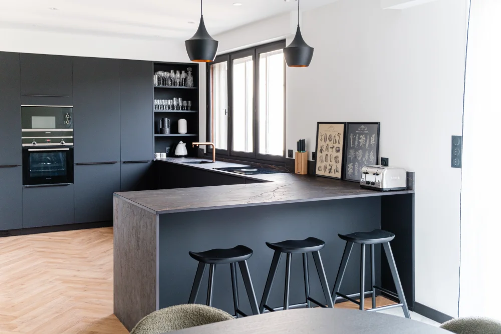 Plan de travail et crédence « coup de torchon » Dekton© Laurent. Pose : Granico 33
