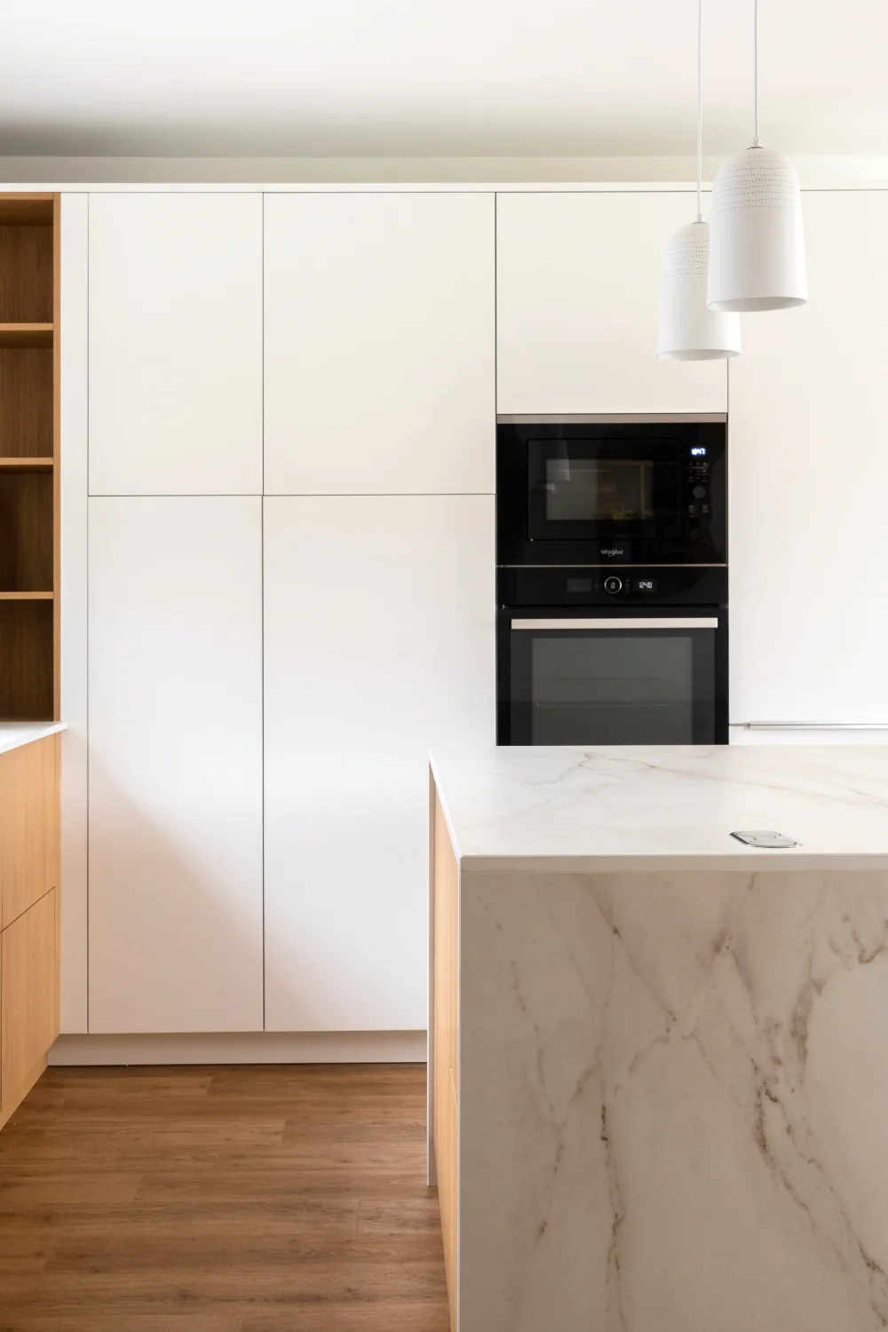 Meuble Armony© modèle Kappa, poignées bois, coloris laque UV X-White mat, plan de travail et crédence Creta.