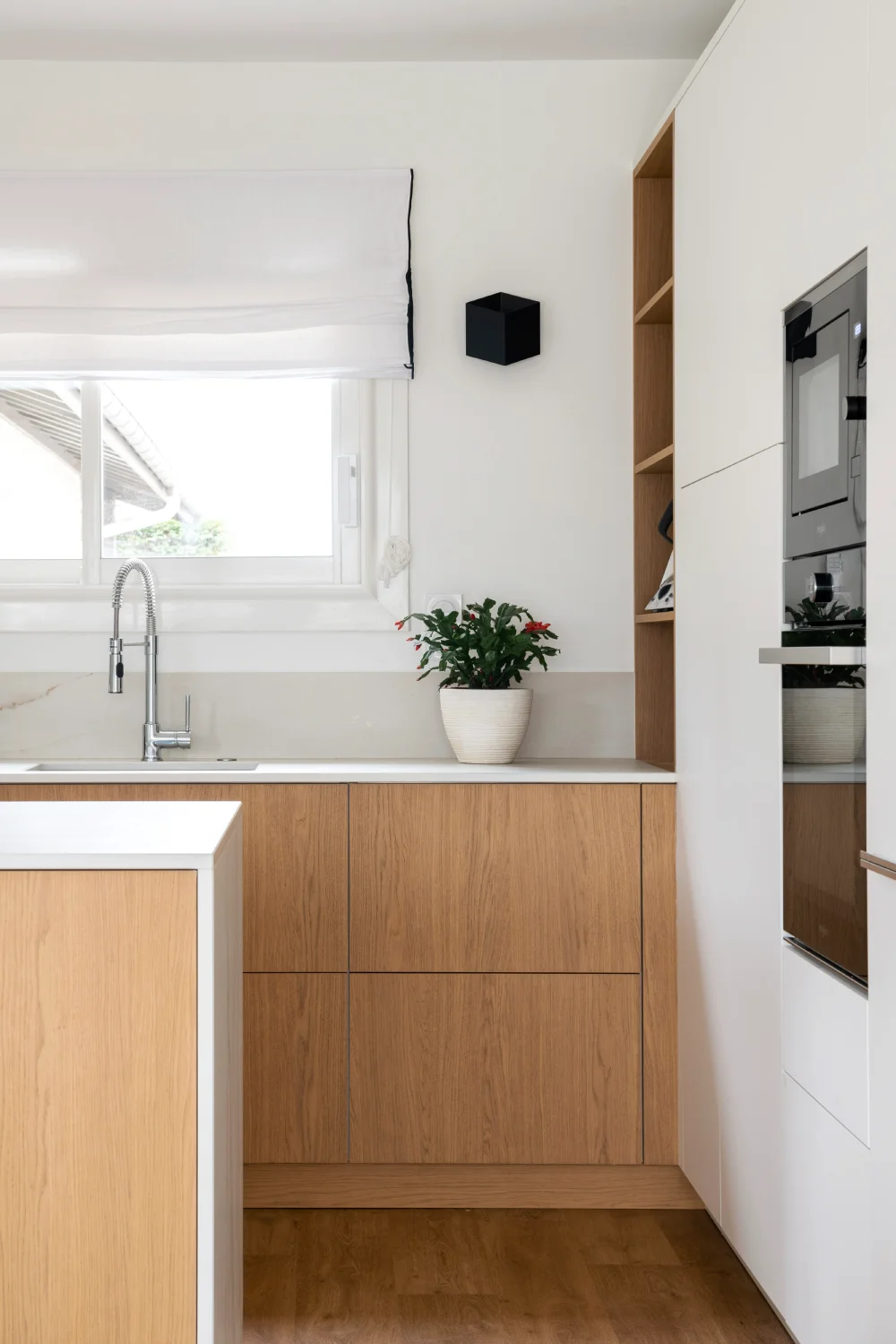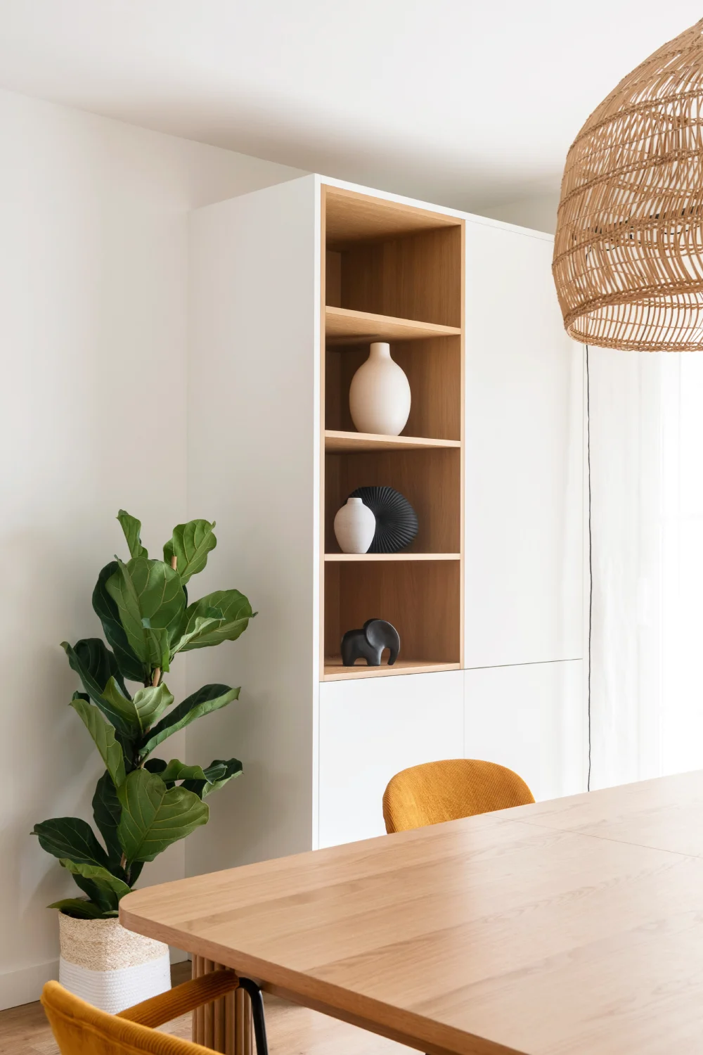 Meuble Armony© modèle Yota, ouverture Push-Pull, plaquage de chêne naturel et modèle Kappa, coloris laque UV X-White mat.